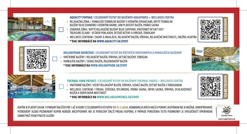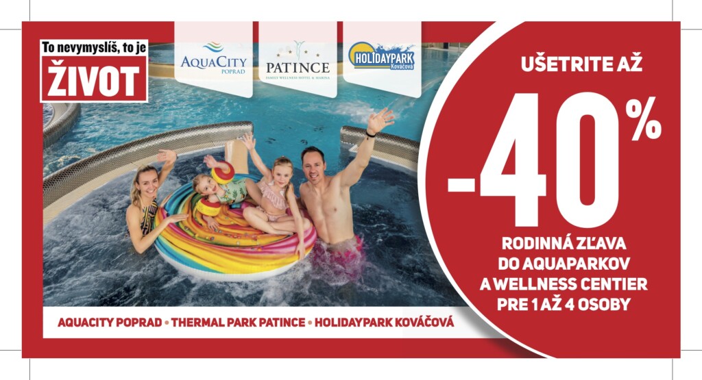 📍 Kupón môžete využiť v AquaCity Poprad, Holidayparku Kováčová alebo Thermal parku vo Wellness Hoteli Patince.